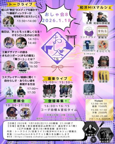 おしゃれとおしゃべり、おしゃしんも。おしゃ会とは、感性を通じた出会いを楽しむ"和洋MIXフェス"です!!